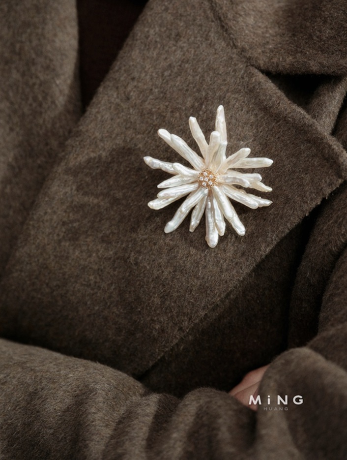 以海洋生物为灵感设计的自然庭院-海葵珍珠胸针,打破传统珠宝的规整感,通过不规则淡水珍珠模拟海葵触手的自然形态,中心镶嵌锆石点缀成花蕊,兼具灵动美感与日常佩戴的实用性,是全场景穿搭的点睛之笔。